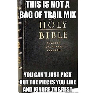 Basically, if you're going to pick apart that it is an "abomination to lie with man as one lies with woman", might want to go through your closet and your pantry and your whole life, because you can't follow one Leviticus order and not the rest. I want you to tell me definitively how you can only follow one of these and still claim to be following the Bible and God's Word. Until you can do that, your argument is invalid.